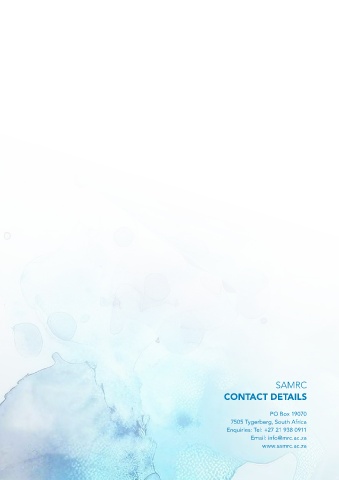 SAMRC CONTACT DETAILS PO Box 19070 7505 Tygerberg, South Africa Enquiries: Tel: +27 21 938 0911 Email: info@mrc.ac.za www.samrc.ac.za